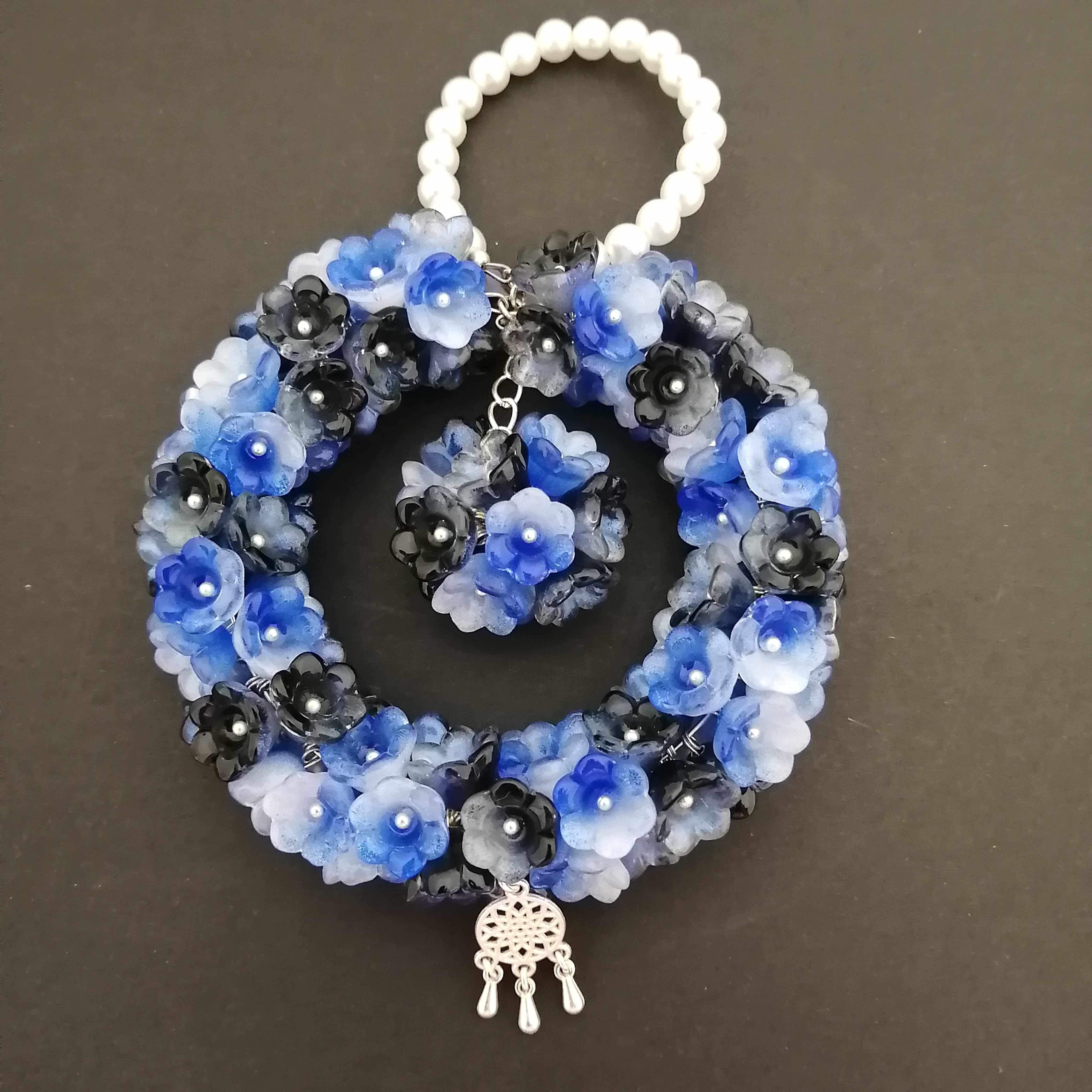 リース ハンドメイド 鈴蘭ビーズ ガラス 青 約85×85mm 1個 [H001]